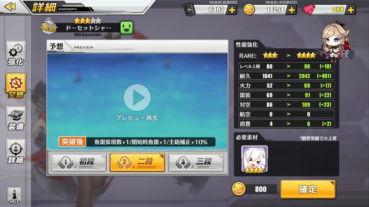 ※限界突破の素材選択画面(実施するドーセット―シャーは初回突破なので、必要数は1つだけ)